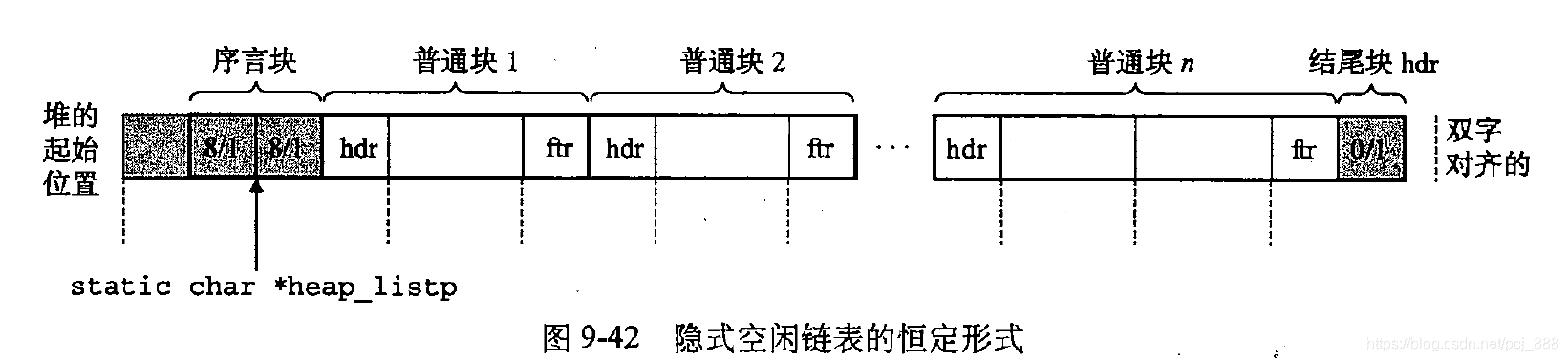 - 为什么是”隐式”的?—— 因为空闲块是通过头部中大小字段隐含地连接着,从而间接遍历整个空闲块的集合。