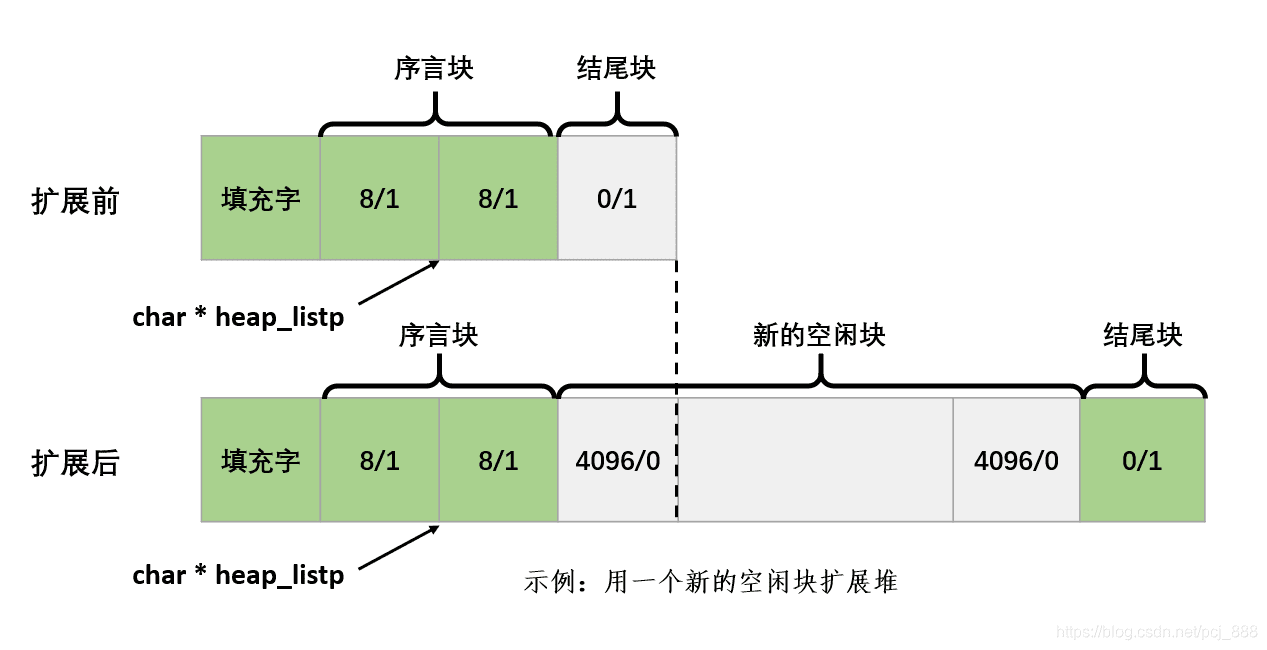 举例:堆上扩展4096个字节,堆数组前后变化如下: