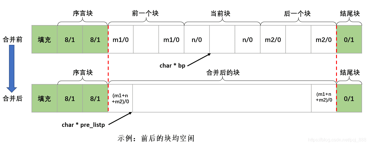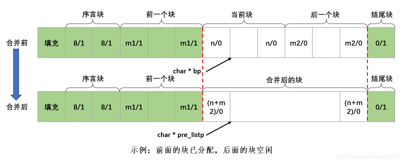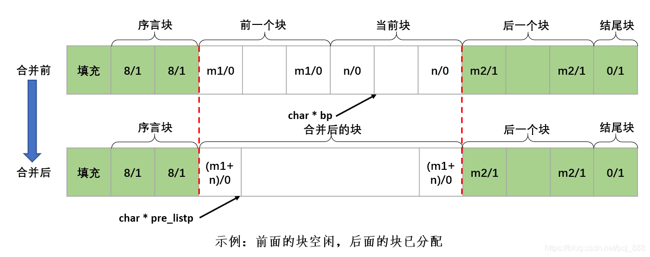 调用coalesce合并前后的合并块,原型:static void *coalesce(void *bp);,分四种情况: