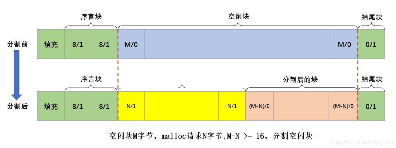 设空闲块大小为M字节,malloc请求的块大小为N字节。只有M - N >= 16,才分割这个块。