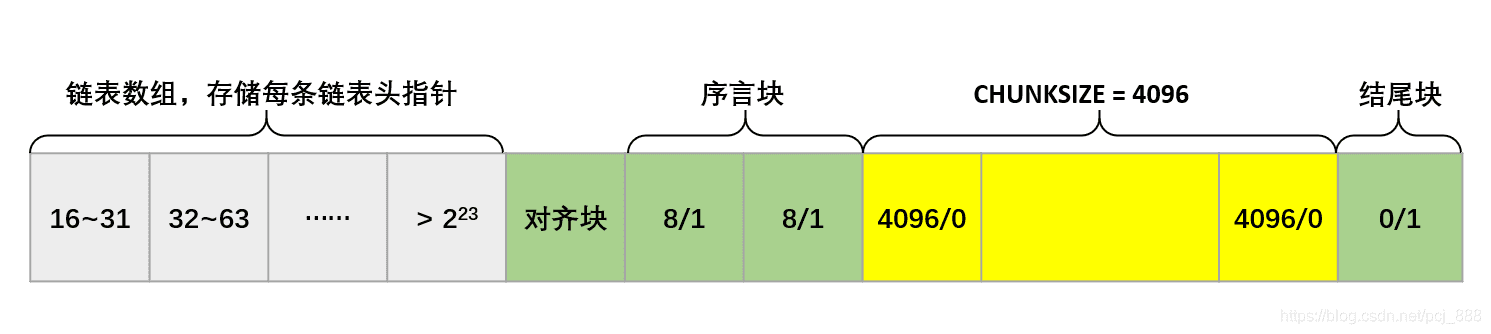 - 大小类分为 {16-31},{32,63},{64,127}, …, {4096, 8191}, … 链表个数