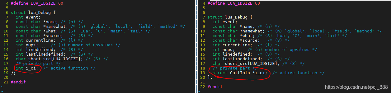 lua_Debug结构体在lua.h定义的,这个错误原因是由于两个.so编译使用的lua.h头文件不一致,导致栈溢出问题。 以下分别给出两个.so的lua.h: