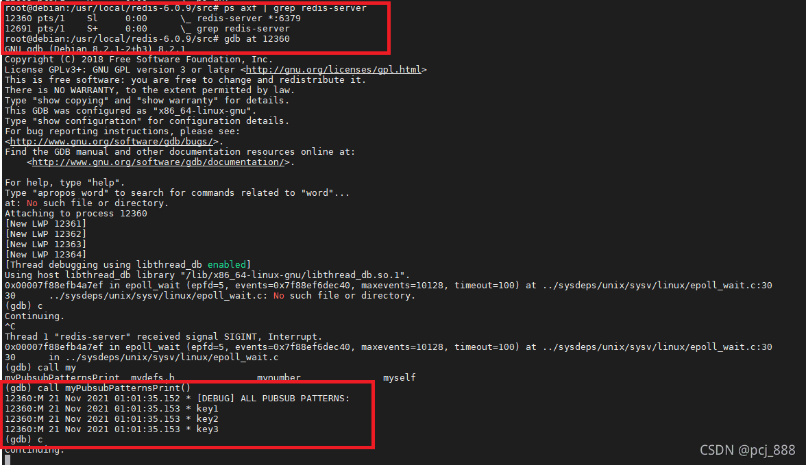 2、重新编译并安装redis-server,后台gdb call一下自定义的打印函数myPubsubPatternsPrint得到模式链表的内容,如下图所示:
