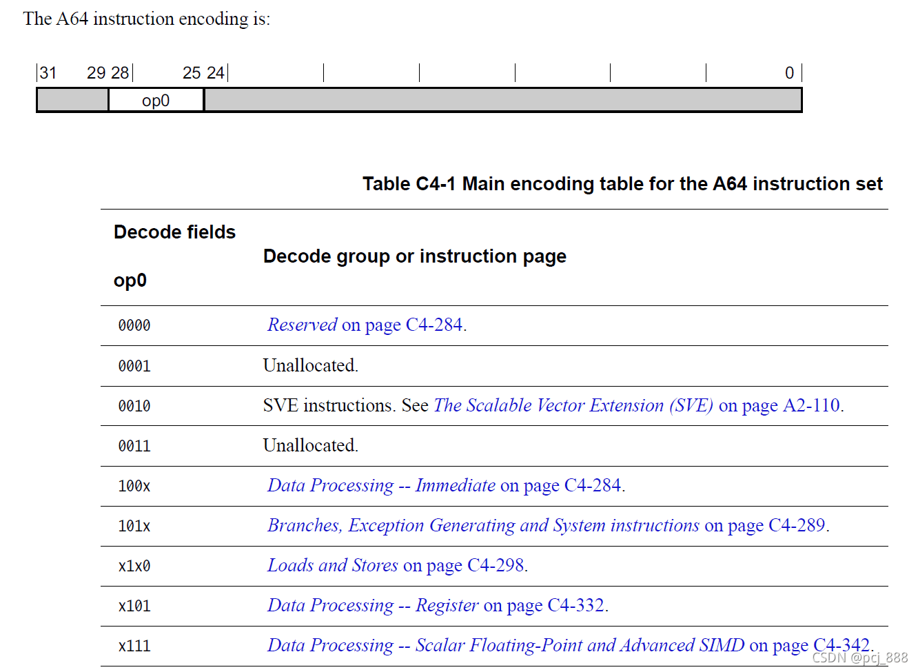 查询ARMv8指令集手册(C4.1 A64 instruction set encoding),先来看下A64 指令集编码格式: