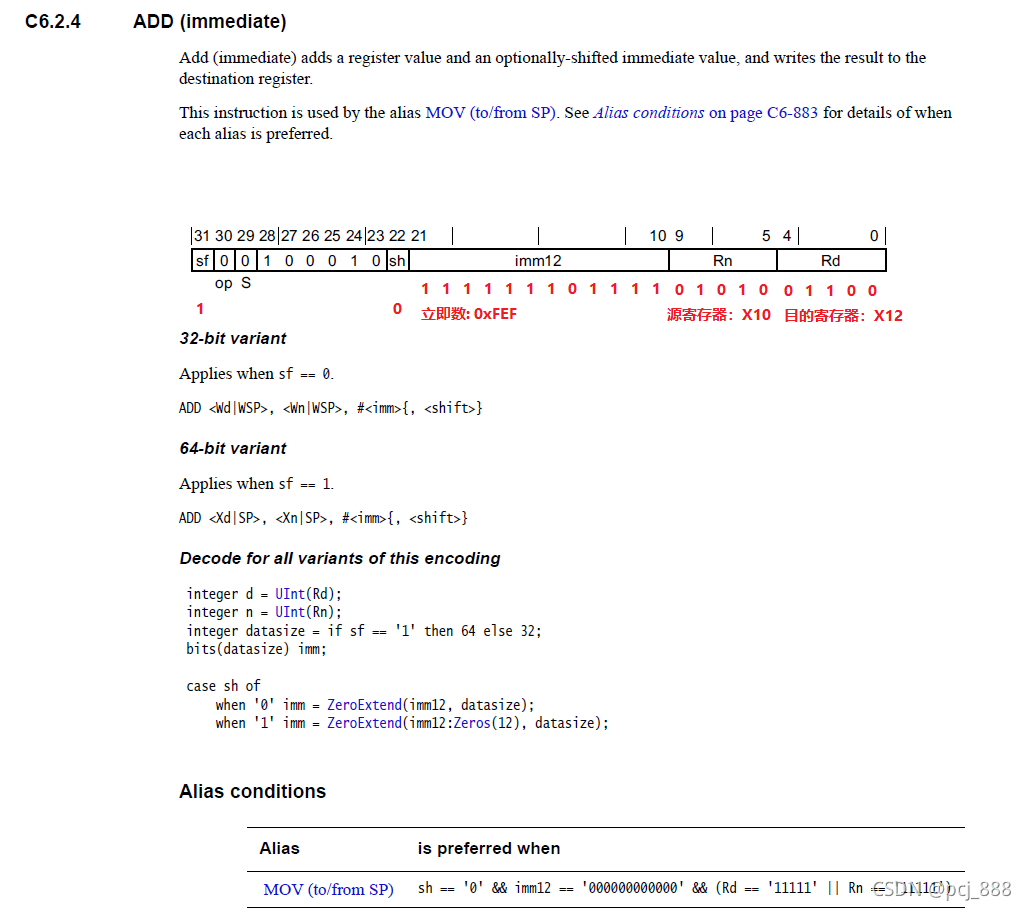 ADD指令的编码格式和伪码,可以参考手册 C6.2.4 ADD(immediate),或下图: