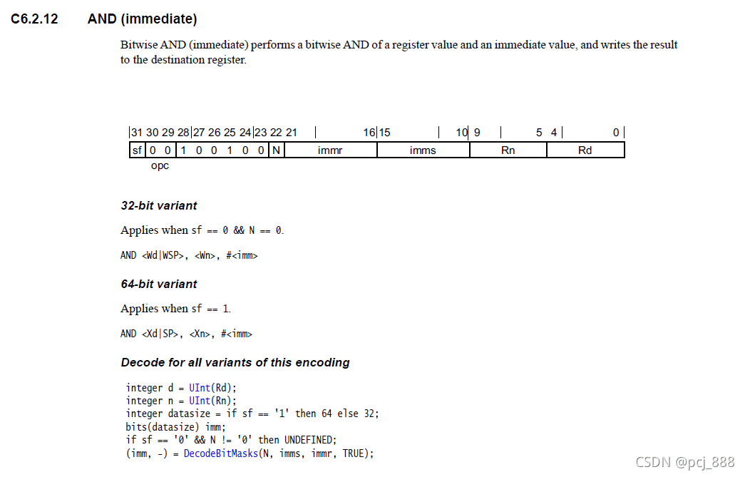 AND指令的编码格式和伪码参考手册 C6.2.12 AND(immediate),或下图: