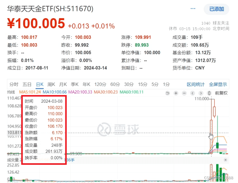 3月8号,华泰天金ETF(511670)离奇暴涨6.17%, 收盘价106.17元。作为一个净值100元的货币基金,正常收益一年也就2%,单日6%的溢价相当于用1天时间提前兑现3年的收益,一个货币基金也可以玩这么嗨,我实在是无法理解!