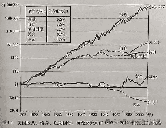 杰里米·西格尔教授在他的经典之作《股市长线法宝》(Stocks for the long run)中,给出了各资产在1802-2012年的真实收益: