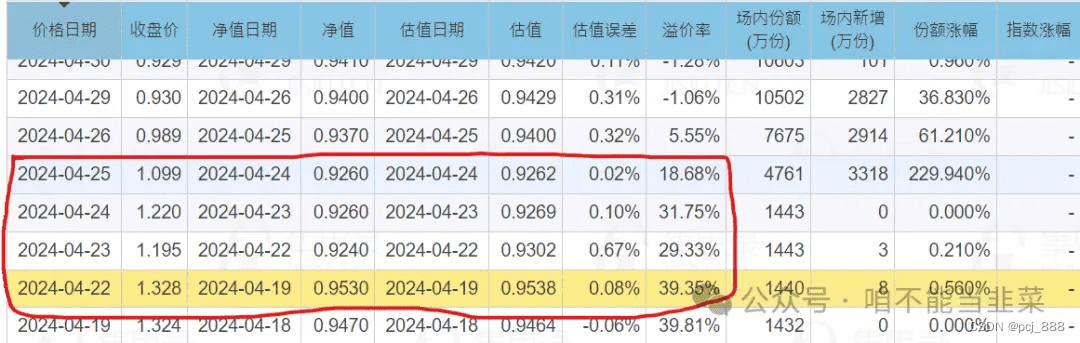 4月25日,场内新增的申购份额有3318万份,但成交额只有228万,只有不到10%的套利党成功出货。我当天成功出掉一组拖拉机,直接白捡 (1.099-0.924)/0.9241007=132元