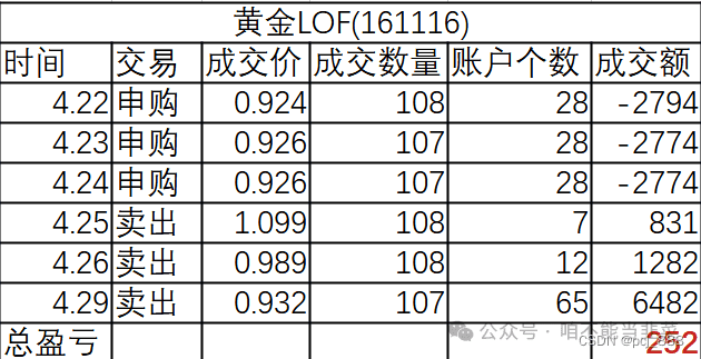 4月22日,黄金LOF(161116)开放申购,限额100元,场内溢价42%,22日场内申购的份额在25日可以卖出。