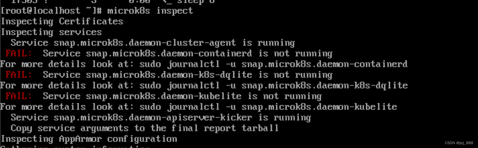 microk8s inspect,检查相关service启动是否正常,发现snap.microk8s.daemon-containerd服务没有running.![]()