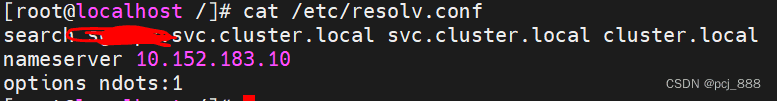 敲kubectl exec -it [pod_name] -- bash进入pod后台,查看/etc/resolv.conf,发现nameserver配的有问题。这里我预期的nameserver应该使用宿主机的,但实际上用的是coredns的。