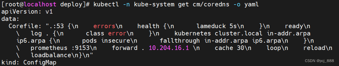 通过kubectl -n kube-system get cm/coredns -o yaml查看coredns配置,发现coredns里配置的dnsserver为10.204.16.1,这个IP我也配错了,再加上之前pod里配的策略是ClusterFirstWithHostNet,这两个错误同时出现,导致pod域名解析失败。