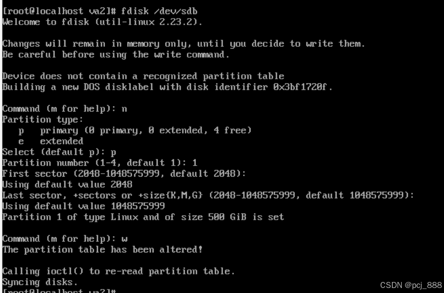 使用fdisk /dev/sdb命令,进行交互式分区操作。依次输入n (new一个分区), 输入p (创建primary分区),输入Partition number(分区编号)为1,其余选项敲回车默认,最后敲w,创建出一个新分区。
