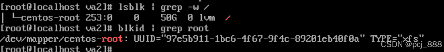 先确认根分区的文件格式,先通过lsblk | grep -w /查到根分区的逻辑卷为centos-root,再通过blkid命令得到根分区的文件格式为xfs