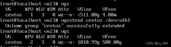vgextend执行后,可以看出逻辑卷组大小从511g变成1010.99g,说明扩展成功