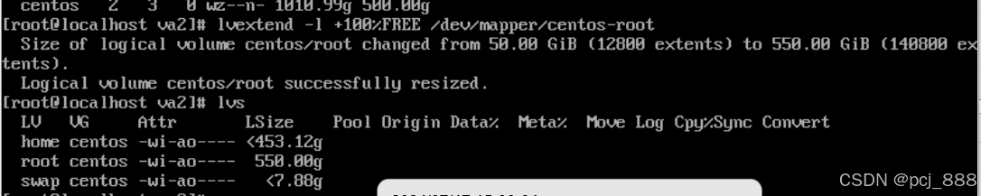 最后查看效果,敲 df -h ,发现根分区大小从50G变成550G,扩容成功!