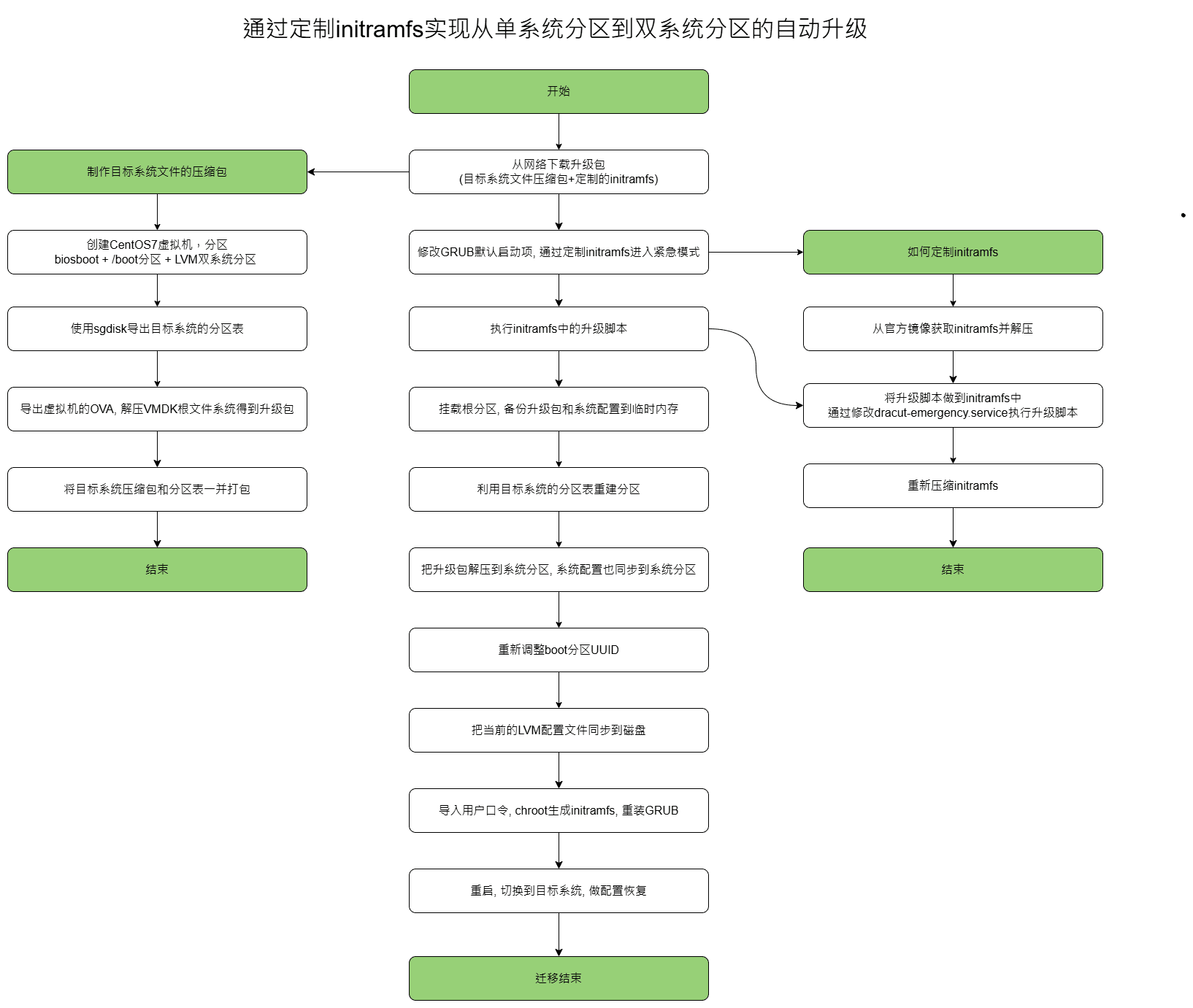 | 定制initramfs | 通过定制initramfs进入紧急模式,预先加载升级包和配置文件到内存,再重建磁盘分区 | 用户无感知, 且备份了旧的配置 | 内存空间有限, 升级包+解压后系统文件需小于内存 |