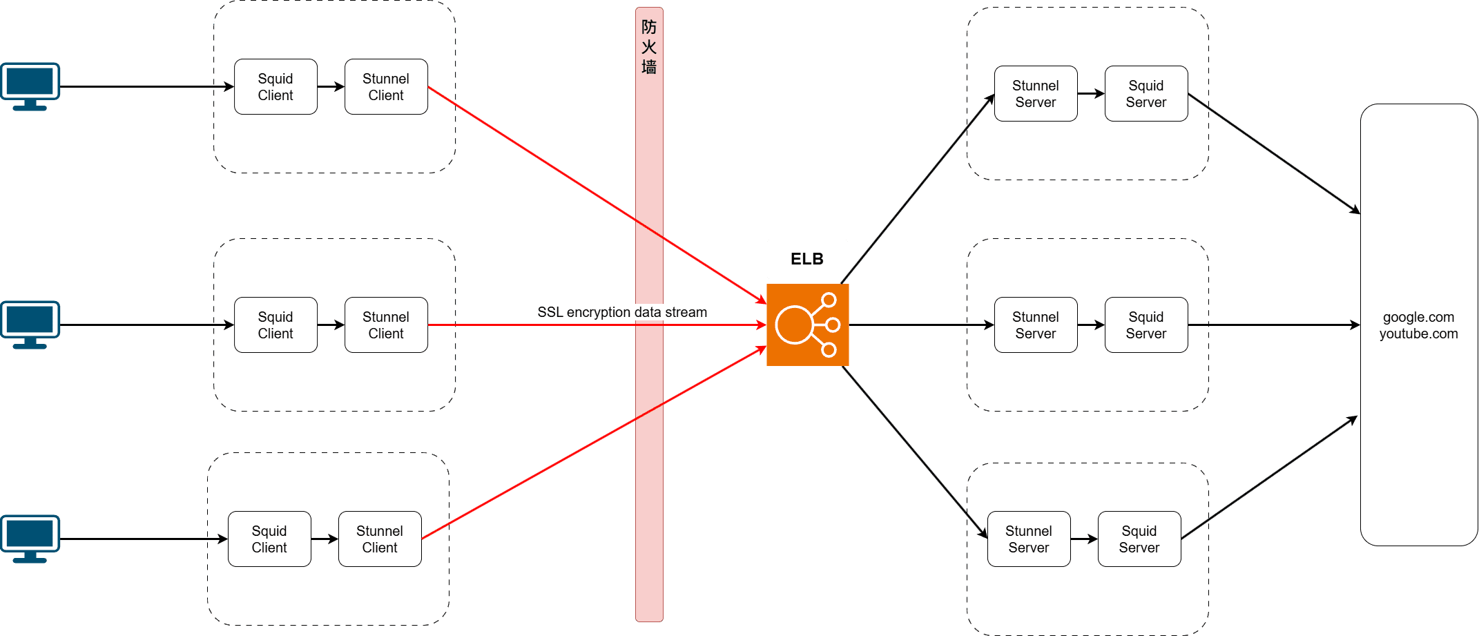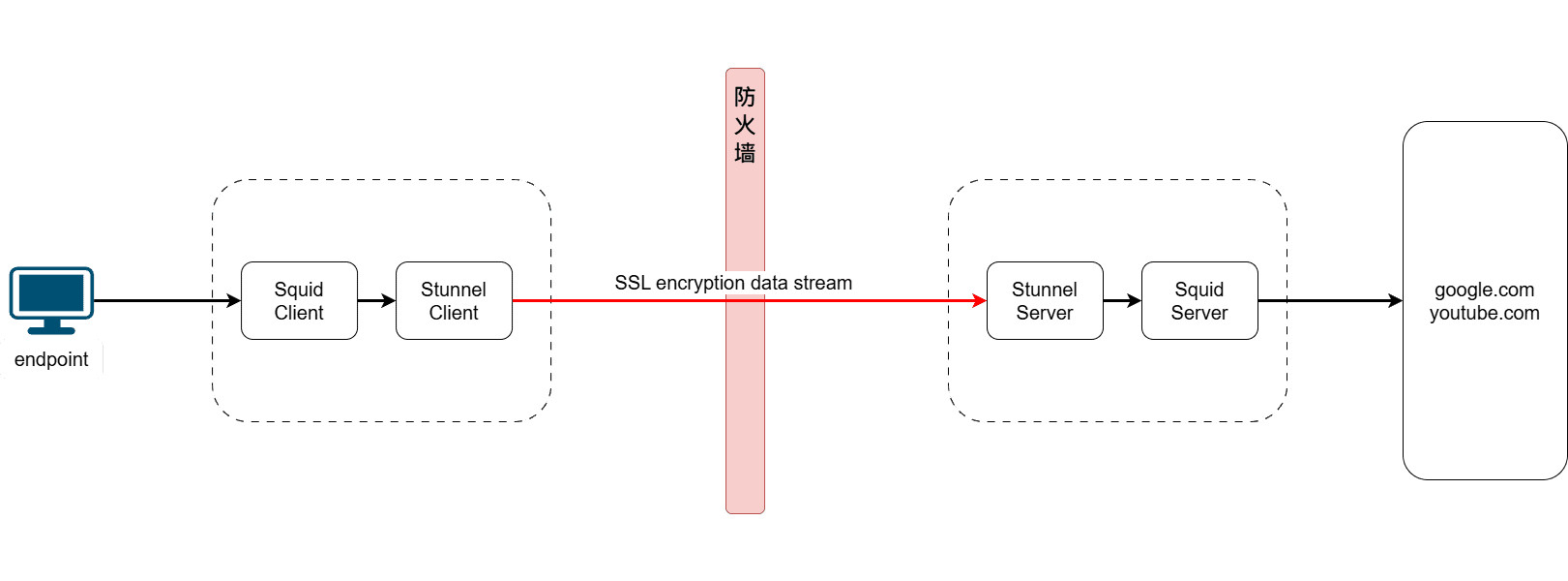 - 墙内部署Squid + Stunnel client, 墙外部署Stunnel Server + Squid, 客户终端的代理设置为墙内的Squid