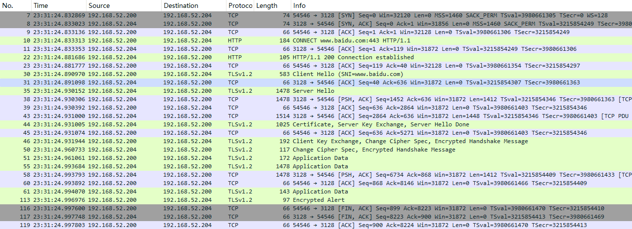 - 代理收到请求后, 和目标服务器建立TCP隧道连接, 并返回200 Connection Established给客户端, 告诉客户端隧道已经成功建立