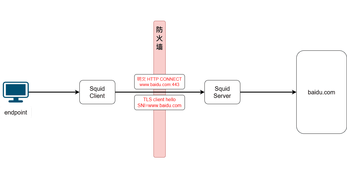 - 然后, 客户端向代理发送明文的HTTP CONNECT请求, 告知代理需要连接的目标服务器