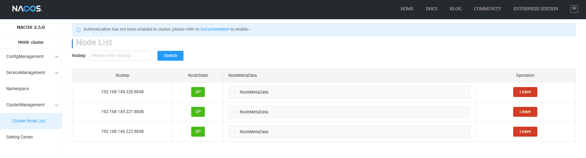 2.验证集群状态:通过浏览器访问其中任意一台Nacos节点的管理页面,例如http://192.168.149.220:8848/nacos,输入用户名和密码(默认用户名和密码均为nacos),查看集群状态,确保三个节点都正常运行。