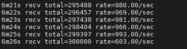 1 2 3 4 5 6 7 8 9 10 11 12 13 14 # 订阅端执行 ./emqtt_bench sub -t "\$share/group1/device/+/telemetry" -c 5 -h emqx-node1.cluster.local -u "test" -P "password@123" # 10个发布端分别执行 ./emqtt_bench pub --ifaddr 10.17.14.210 -t "device/%i/telemetry" -c 50000 -R 500 -I 60000 -h emqx-node1.cluster.local -s 1024 -m "$(base64 /dev/urandom | head -c 1024)" -u "test" -P "password@123" ./emqtt_bench pub --ifaddr 10.17.14.211 -t "device/%i/telemetry" -c 50000 -R 500 -I 60000 -h emqx-node1.cluster.local -s 1024 -m "$(base64 /dev/urandom | head -c 1024)" -u "test" -P "password@123" ./emqtt_bench pub --ifaddr 10.17.14.212 -t "device/%i/telemetry" -c 50000 -R 500 -I 60000 -h emqx-node1.cluster.local -s 1024 -m "$(base64 /dev/urandom | head -c 1024)" -u "test" -P "password@123" ./emqtt_bench pub --ifaddr 10.17.14.213 -t "device/%i/telemetry" -c 50000 -R 500 -I 60000 -h emqx-node1.cluster.local -s 1024 -m "$(base64 /dev/urandom | head -c 1024)" -u "test" -P "password@123" ./emqtt_bench pub --ifaddr 10.17.14.214 -t "device/%i/telemetry" -c 50000 -R 500 -I 60000 -h emqx-node1.cluster.local -s 1024 -m "$(base64 /dev/urandom | head -c 1024)" -u "test" -P "password@123" ./emqtt_bench pub --ifaddr 10.17.14.215 -t "device/%i/telemetry" -c 50000 -R 500 -I 60000 -h emqx-node1.cluster.local -s 1024 -m "$(base64 /dev/urandom | head -c 1024)" -u "test" -P "password@123" ./emqtt_bench pub --ifaddr 10.17.14.216 -t "device/%i/telemetry" -c 50000 -R 500 -I 60000 -h emqx-node1.cluster.local -s 1024 -m "$(base64 /dev/urandom | head -c 1024)" -u "test" -P "password@123" ./emqtt_bench pub --ifaddr 10.17.14.217 -t "device/%i/telemetry" -c 50000 -R 500 -I 60000 -h emqx-node1.cluster.local -s 1024 -m "$(base64 /dev/urandom | head -c 1024)" -u "test" -P "password@123" ./emqtt_bench pub --ifaddr 10.17.14.218 -t "device/%i/telemetry" -c 50000 -R 500 -I 60000 -h emqx-node1.cluster.local -s 1024 -m "$(base64 /dev/urandom | head -c 1024)" -u "test" -P "password@123" ./emqtt_bench pub --ifaddr 10.17.14.219 -t "device/%i/telemetry" -c 50000 -R 500 -I 60000 -h emqx-node1.cluster.local -s 1024 -m "$(base64 /dev/urandom | head -c 1024)" -u "test" -P "password@123"