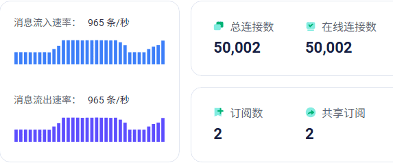 连接数:50002,发布速率:965 msg/s,订阅速率:965 msg/s