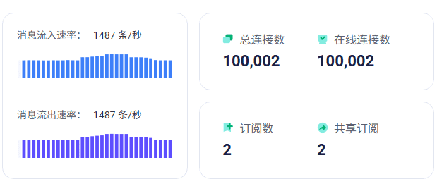 连接数:100002,发布速率:1487 msg/s,订阅速率:1487 msg/s