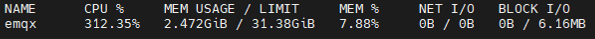 并发连接数测试 用例一:测试2000个并发连接 (2000个发布者,每分钟发布1条消息,2个订阅者,消息大小:1024字节,qos 0) 1 2 3 4 5 # 订阅端执行 ./emqtt_bench sub -t "\$share/group1/device/+/telemetry" -c 2 -h emqx-node1.cluster.local -u "test" -P "password@123" # 发布端执行 ./emqtt_bench pub -t "device/%i/telemetry" -c 2000 -I 60000 -L 6000 -h emqx-node1.cluster.local -s 1024 -m "$(base64 /dev/urandom | head -c 1024)" -u "test" -P "password@123"