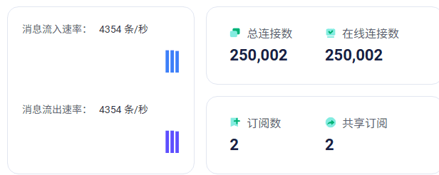 连接数:250002,发布速率:4354 msg/s,订阅速率:4354 msg/s