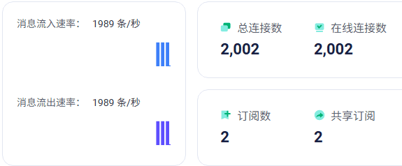 连接数:2002,发布速率:1989 msg/s,订阅速率:1989 msg/s