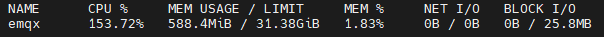 用例四: 测试10w msg/s 吞吐量 (5万个发布者,每秒发布2条消息,20个订阅者,消息大小:1024字节,qos 0) 1 2 3 4 5 # 订阅端执行 ./emqtt_bench sub -t "\$share/group1/device/+/telemetry" -c 20 -h emqx-node1.cluster.local -u "test" -P "password@123" # 发布端执行 ./emqtt_bench pub -t "device/%i/telemetry" -R 500 -I 500 -c 50000 -L 15000000 -h emqx-node1.cluster.local -s 1024 -m "$(base64 /dev/urandom | head -c 1024)" -u "test" -P "password@123"