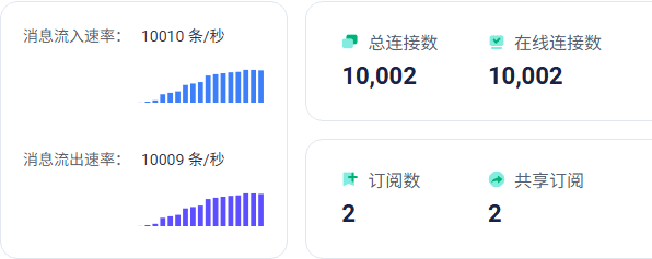 连接数:10002,发布速率:10010 msg/s,订阅速率:10009 msg/s
