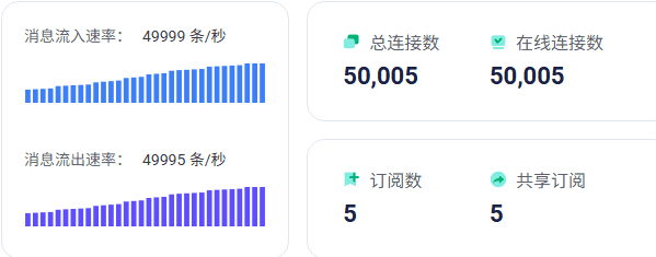 连接数:50005,发布速率:49999 msg/s,订阅速率:49995 msg/s