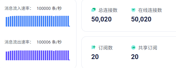 连接数:50020,发布速率:100000 msg/s,订阅速率:100006 msg/s