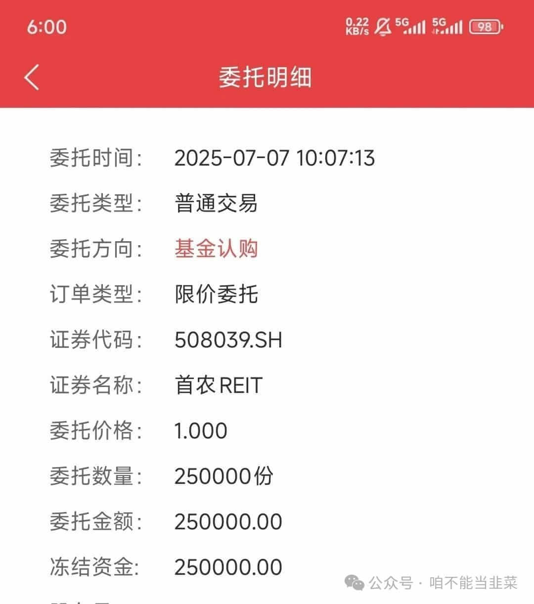7月7号(周一), 我参与了首农REIT基金的打新, 认购了25w。资金周三晚上到账,共占用3天