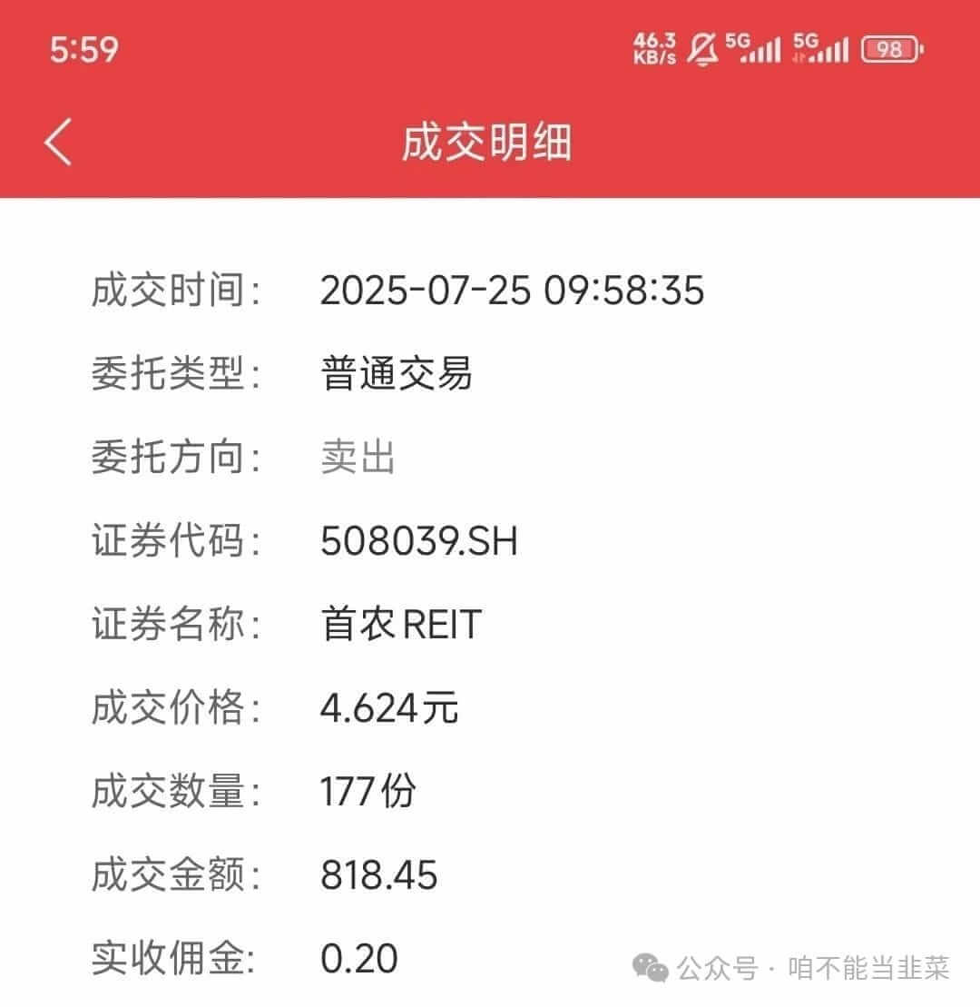 这次中签177份, 市值652.3元, 中签率0.26%。7月25号REIT上市, 当天表现一般, 没有封30厘米涨停。我在4.624元的位置卖掉了份额, 涨幅约25%